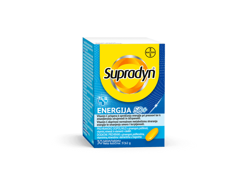 Pripravljen je posebej za to, da bi zadostil specifičnim potrebam organizma v zreli življenjski dobi (po 50. letu starosti). Eno tableto Supradyn® energija 50+ vzemite med obrokom, po možnosti zjutraj pri zajtrku.